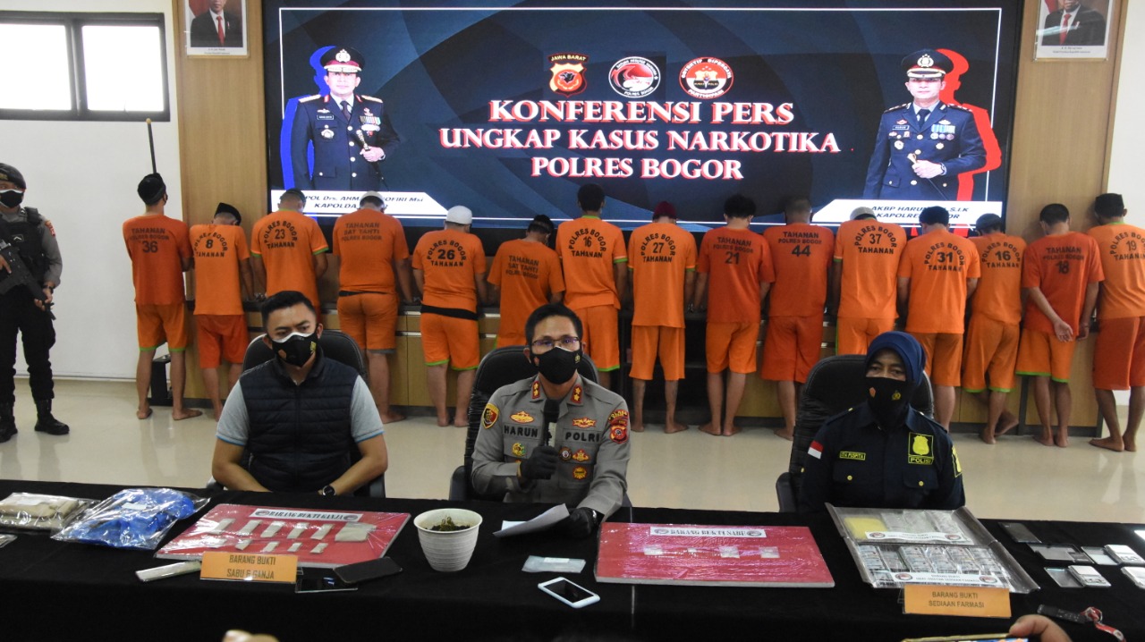 Polres Bogor berhasil lakukan pengungkapan Penyalahgunaan narkotika yang beredar di wilayah kabupaten Bogor, dimana dari Pengungkapan tersebut sebanyak 16 tersangka berhasil di amankan Satuan Narkoba Polres Bogor.