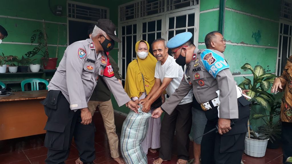 Polsek Jasinga pun turut membantu memberikan 50 kg beras untuk warga masyarakat yang rumahnya mengalami rusak berat akibat banjir.