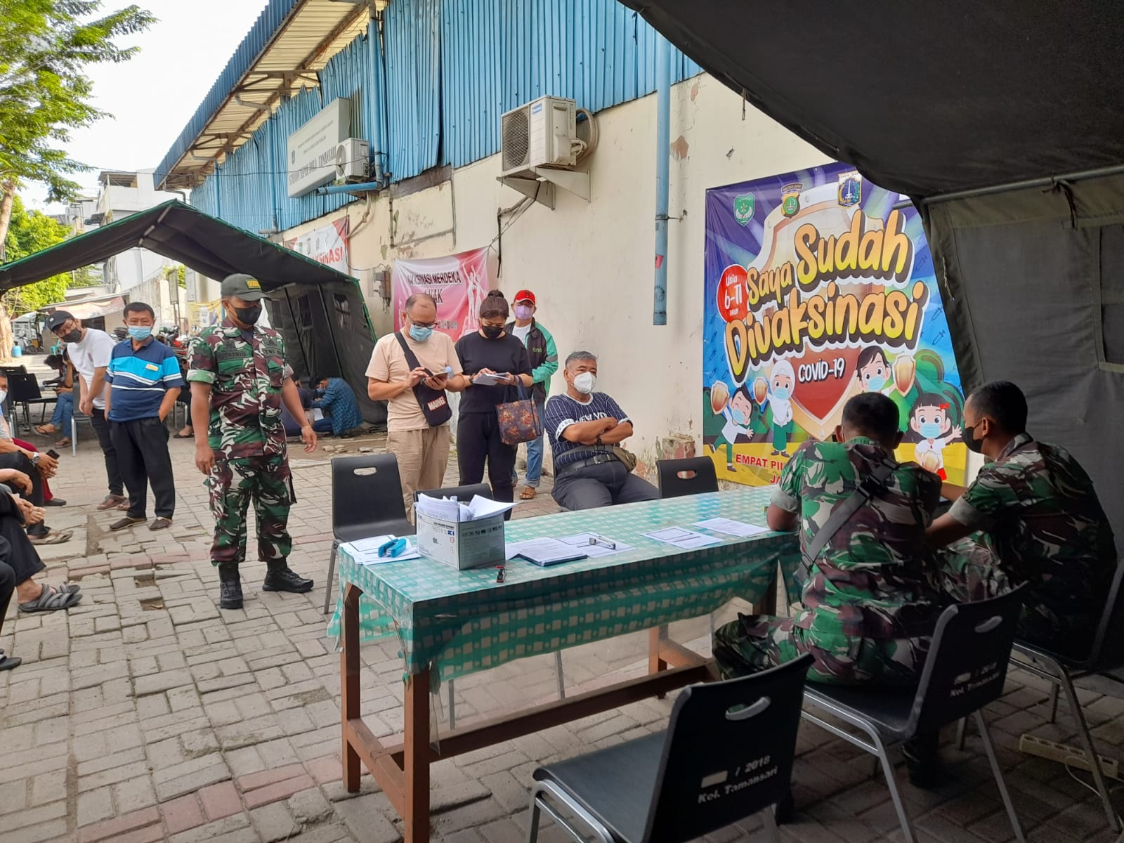 Jakarta-Kodim 0503/JB,Koramil 01/TS – Serbuan vaksinasi TNI Kodim 0503/Jakarta Barat yang di laksanakan Koramil 01/Tamansari di halaman stadion sepak bola tamansari, Rt. 008/01, Kelurahan Tamansari, Kecamatan Tamansari berjalan lancar dengan menerapakan protokol kesehatan sesuai anjuran pemerintah.
