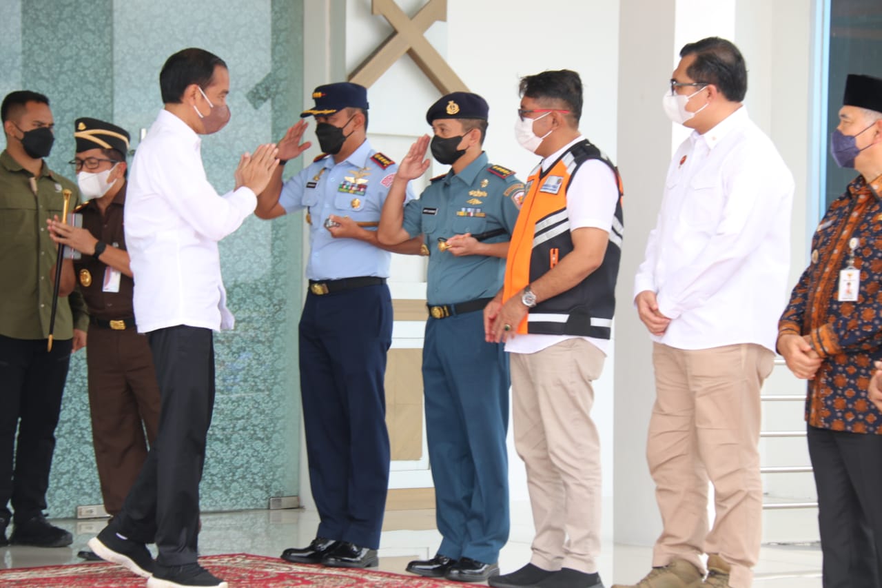 Komandan Pangkalan TNI Angkatan Laut Palembang Kolonel Laut (P) Widyo Sasongko bersama Forum Koordinasi Pimpinan Daerah (FKPD) Provinsi Jambi menyambut kedatangan Presiden Joko Widodo beserta Ibu Hj. Iriana Widodo beserta Rombongan di VIP Room Bandar Udara Sultan Thaha Saifuddin, Kota Jambi, Kamis (7/4/2022).