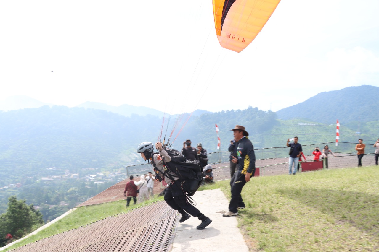 Bogor Kab-Pengibaran bendera merah putih melalui penerbangan paralayang di gelar Polres Bogor di Gantole yang berada di kawasan Cisarua puncak Bogor, Pada Kamis (23/06).