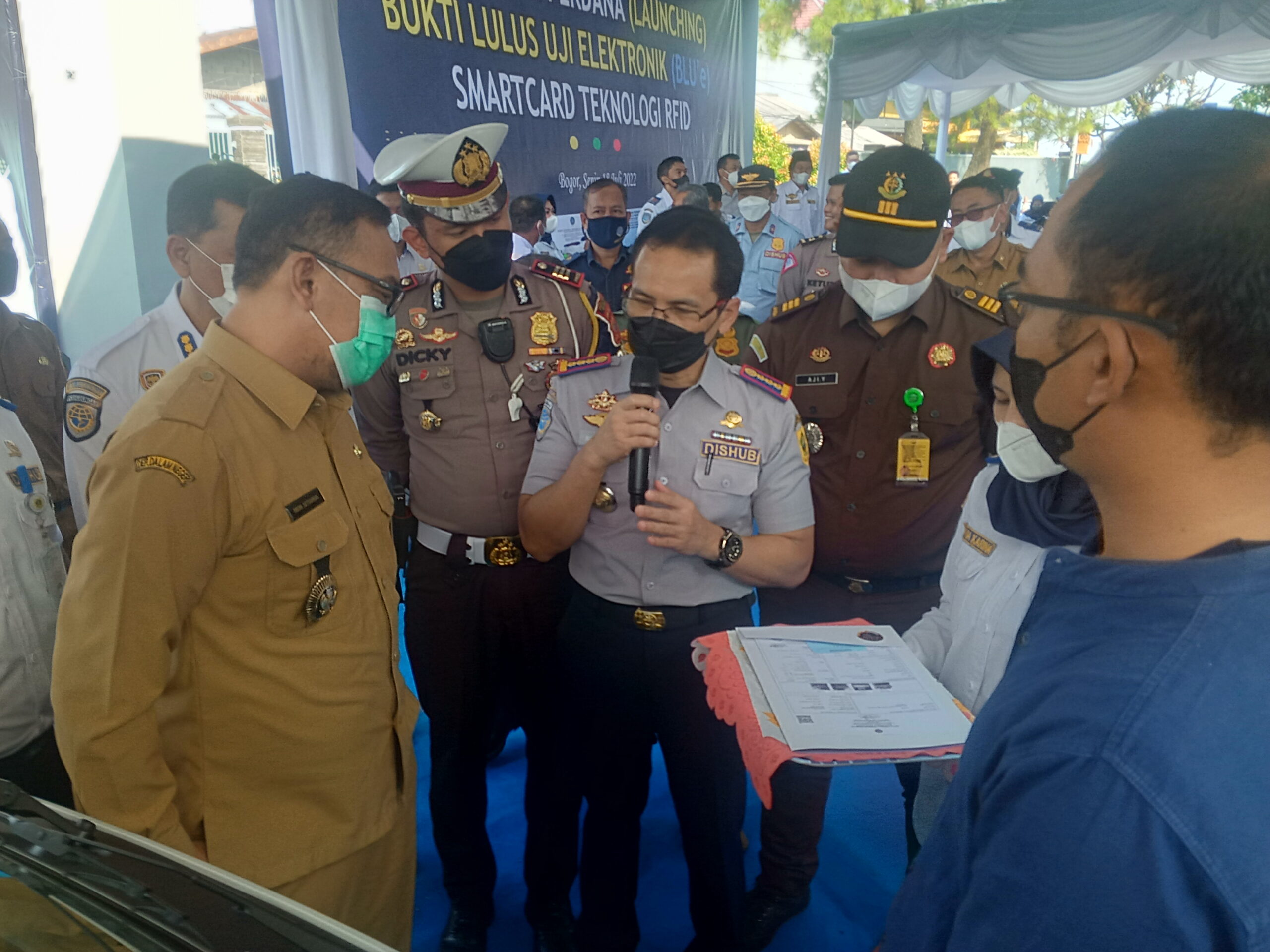 Pemerintah Kabupaten (Pemkab) Bogor melalui Dinas Perhubungan (Dishub) Kabupaten Bogor untuk pertama kalinya menerapkan layanan pengujian kendaraan bermotor secara elektronik, melalui peluncuran Penerapan Bukti Lulus Uji secara Elektronik (Blue) Berupa Smartcard Berbasis Radio Freguency Identification (RFID) yang dilakukan langsung oleh Plt. Bupati Bogor (Iwan setiawan) di Kantor Dishub Kabupaten Bogor, Senin (18/7/22).