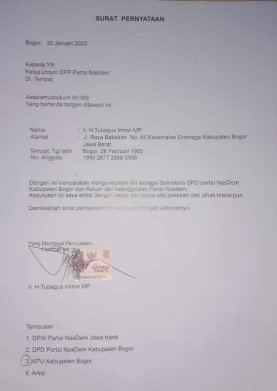 Kader Partai NasDem Kabupaten Bogor, Tubagus Imron MP menyatakan mundur dari Jabatannya, sebagai anggota partai dan Sekretaris DPD Kabupaten Bogor,