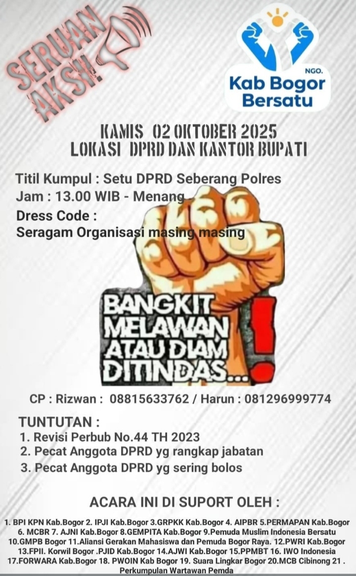 “Kami akan lakukan aksi tanggal 2 Oktober 2025. Aksi ini merupakan gabungan komponen masyarakat Kabupaten Bogor yang melibatkan LSM, Ormas, Wartawan, Mahasiswa, dan masyarakat umum. Kami bersatu menuntut perubahan dan transparansi pemerintahan,” tegasnya, Rabu (1/10/2025).