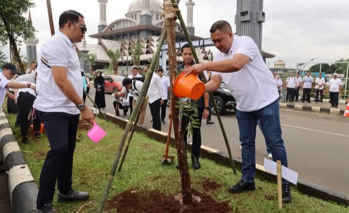 Bupati Bogor, Rudy Susmanto memimpin langsung korve penanaman 1.000 pohon di kawasan Gelora Pakansari, Cibinong, Selasa (18/2). Kegiatan melibatkan Forum Koordinasi Pimpinan Daerah (Forkopimda), jajaran DPRD Kabupaten Bogor ASN Pemerintah Kabupaten (Pemkab) Bogor, unsur TNI, Polri, serta organisasi kemasyarakatan.